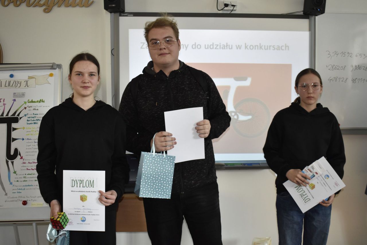 14 marca w naszej szkole odbyły się obchody ,,Międzynarodowego Dnia Liczby π”. Miały one na celu pokazanie, że matematyka to nie tylko liczby, wzory i trudne zadania, ale również znakomita przygoda i zabawa. Uczniowie z dużym zaangażowaniem brali udział w konkursach na ,,Plakat zawierający informacje i ciekawostki o liczbie π”, ,,Mistrz Pamięci”, quiz o liczbie π oraz zmierzyli się z układaniem kostki Rubika. Spośród 104 plakatów wyróżnione zostały 3 plakaty: Zuzanny Ziółkowskiej z klasy 2 TRE, Igora Romanowskiego z klasy 4 TRE i Roksany Węcławek z klasy 4 TRA. W konkursie ,,Mistrz Pamięci” bezkonkurencyjny był Brajan Pawelec z klasy 4 TI, który wypisał 216 cyfr po przecinku rozwinięcia dziesiętnego liczby π, drugie miejsce zajęła Michalina Górecka z klasy 2 TRE - 89 miejsc po przecinku i Łukasz Jabłoński z 3 TIA. Mistrzem w układaniu kostki został Miłosz Chmielewski z klasy 5 TEI, który w 15 sekund ułożył kostkę Rubika. Kolejne miejsca zajęły: Martyna Lisińska – 1 TRE i Wiktoria Wytrykowska 1 TRA. Nagrody rzeczowe ufundowane zostały z Rady Rodziców, której serdecznie dziękujemy. Wszyscy zaangażowani uczniowie otrzymali również oceny z matematyki. Organizatorem Międzynarodowego Dnia Liczby π byli Katarzyna Cieciurska oraz Bogdan Sęk.
